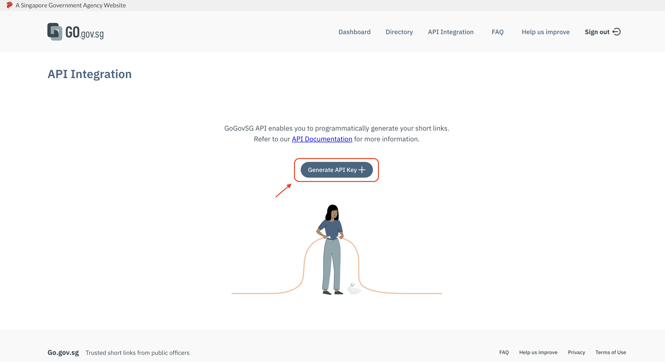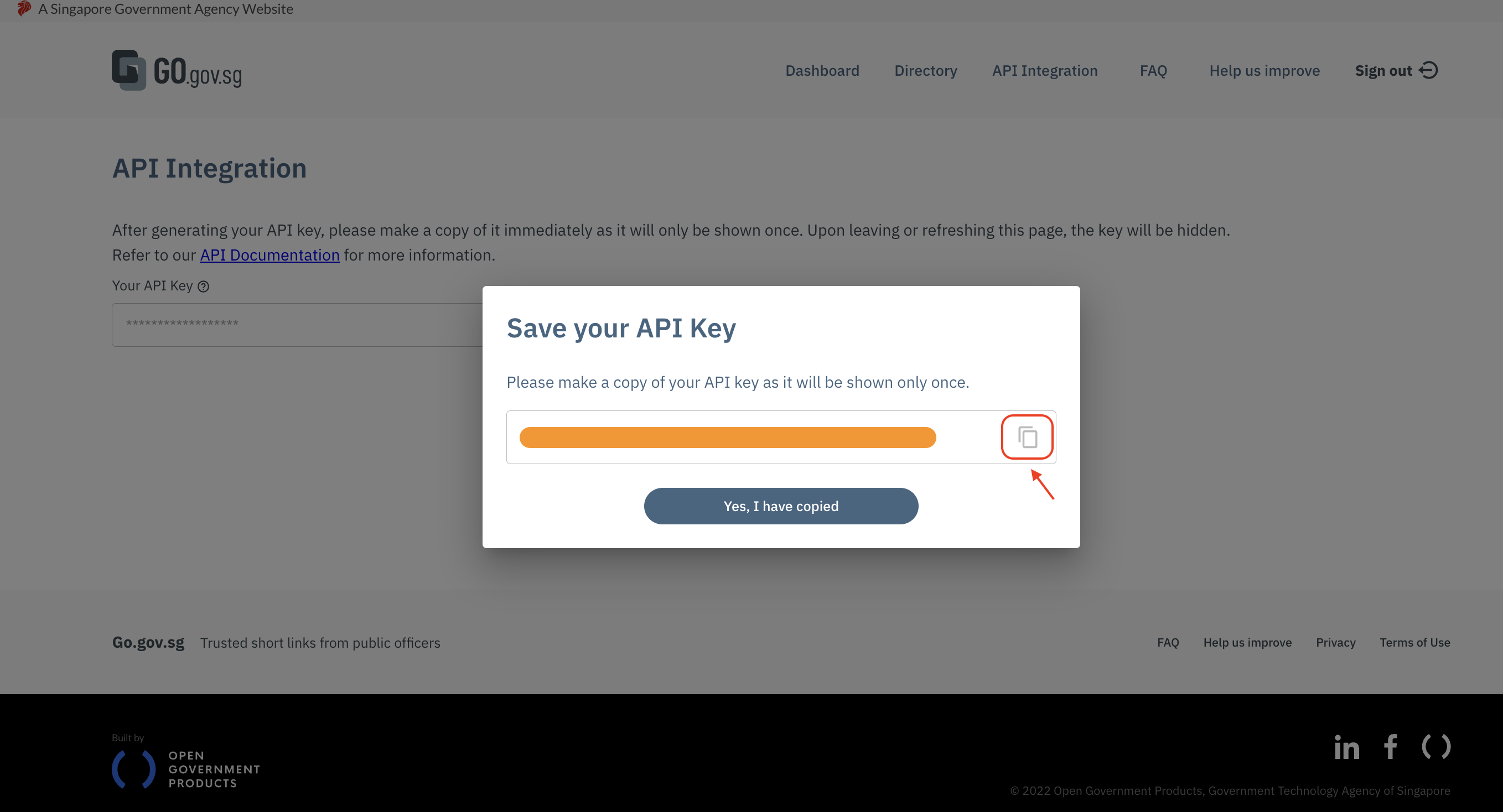To generate the token, click on "API Integration" in the navigation bar. From there, click on `Generate API key` and copy the token. Use this key to start using GoGovSG's API.&#x20;